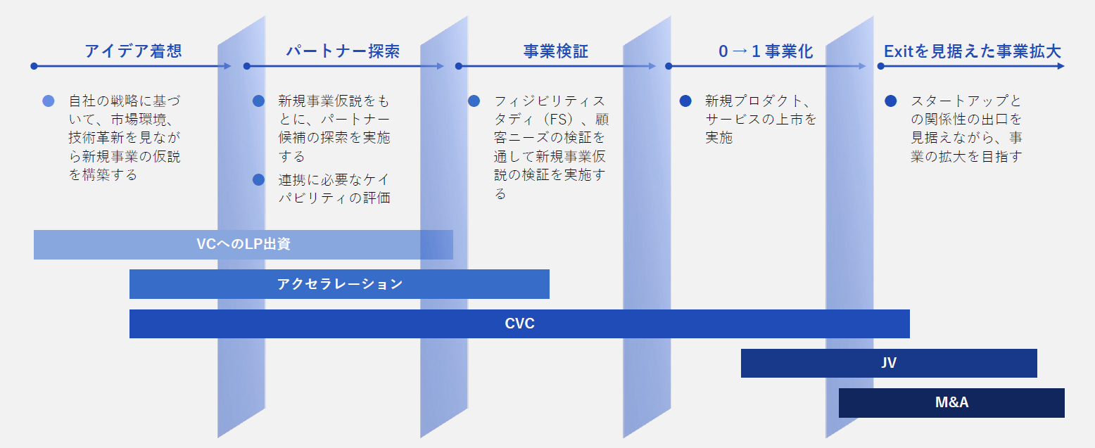 アイデア着想 → パートナー探索 → 検証 → 事業化